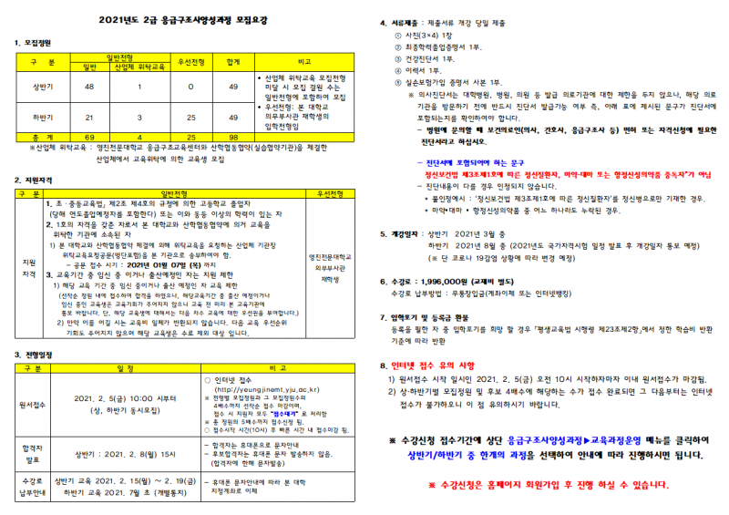 페이지 정보 작성자 응급구조교육센터 댓글 0건 조회 3,337회 작성일 20-12-03 15:46 목록 본문 2021년도 2급 응급구조사양성과정 모집요강 안내 2020-12-03, 3,337 2021년 2급 응급구조사양성과정 모집요강 입니다. 이전글2급응급구조사양성과정 접수방법 안내 및 자주 묻는 질문 21.02.04 다음글42기 비대면 이론수업 시간표 재공지 20.11.12 목록